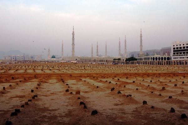 Na obrázku: Pohřebiště البقيع al-Bakí‘ v Medíně, kde spočívají Prorokovi صلى الله عليه و سلم společníci včetně jeho manželek (matek věřících) رضي الله عنهم.